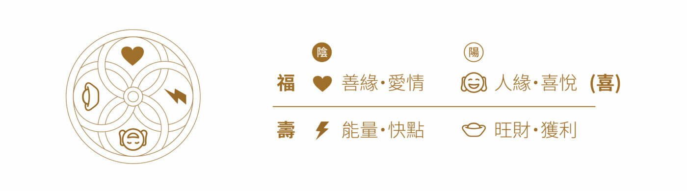 為傳統文化裡的太極,兩個90度重疊,下層為十字星,鏤空處交錯出吸納(放射)動態。錢幣雷雕面,採用跨越國際的現代圖示,表達傳統「福,祿,壽」的祝福,也可用於決策、占卜、起卦,自由啟發解讀。
