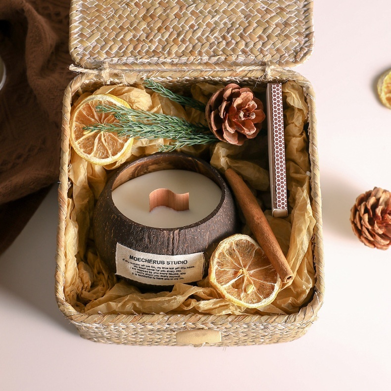 商品包含:竹編籃、雪梨紙、檸檬片、松果、桂枝、裝飾葉子、椰殼香氛蠟燭、火柴盒