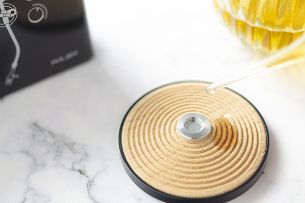 圓形櫸木轉盤為磁力吸附,可直接取下添加香味於轉盤背面木頭處,請依照自己的喜好酌量滴入。