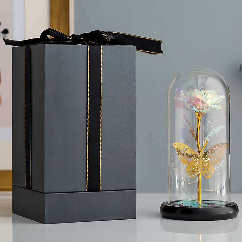 這款玻璃罩玫瑰花,搭配彩金蝴蝶款設計,是一份極具藝術感與象徵意義的禮物。