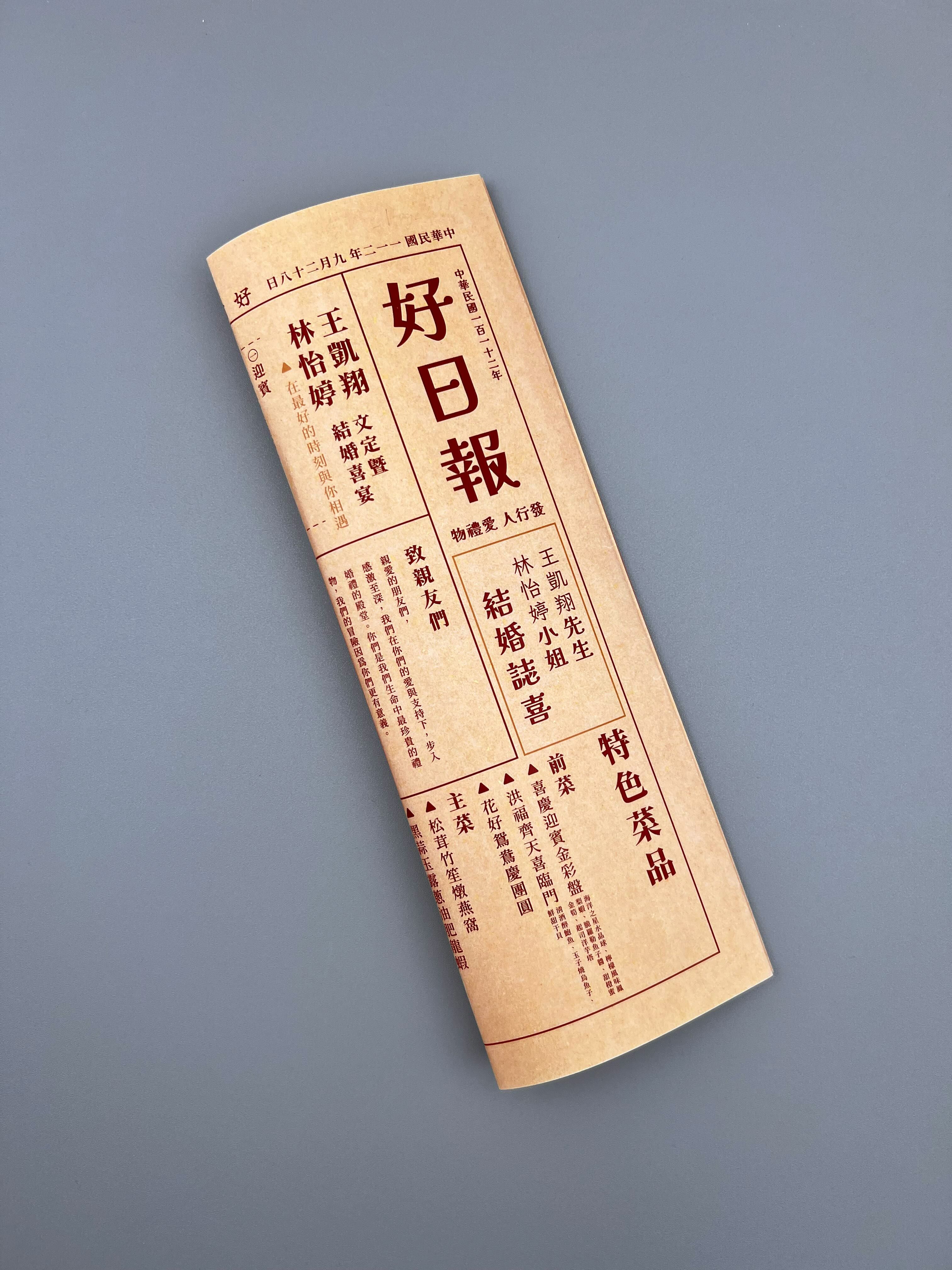 獨特/有趣/復古/專屬於你的婚禮報紙,讓每位賓客都可以收藏您的過去與現在,且給予未來滿滿的祝福。